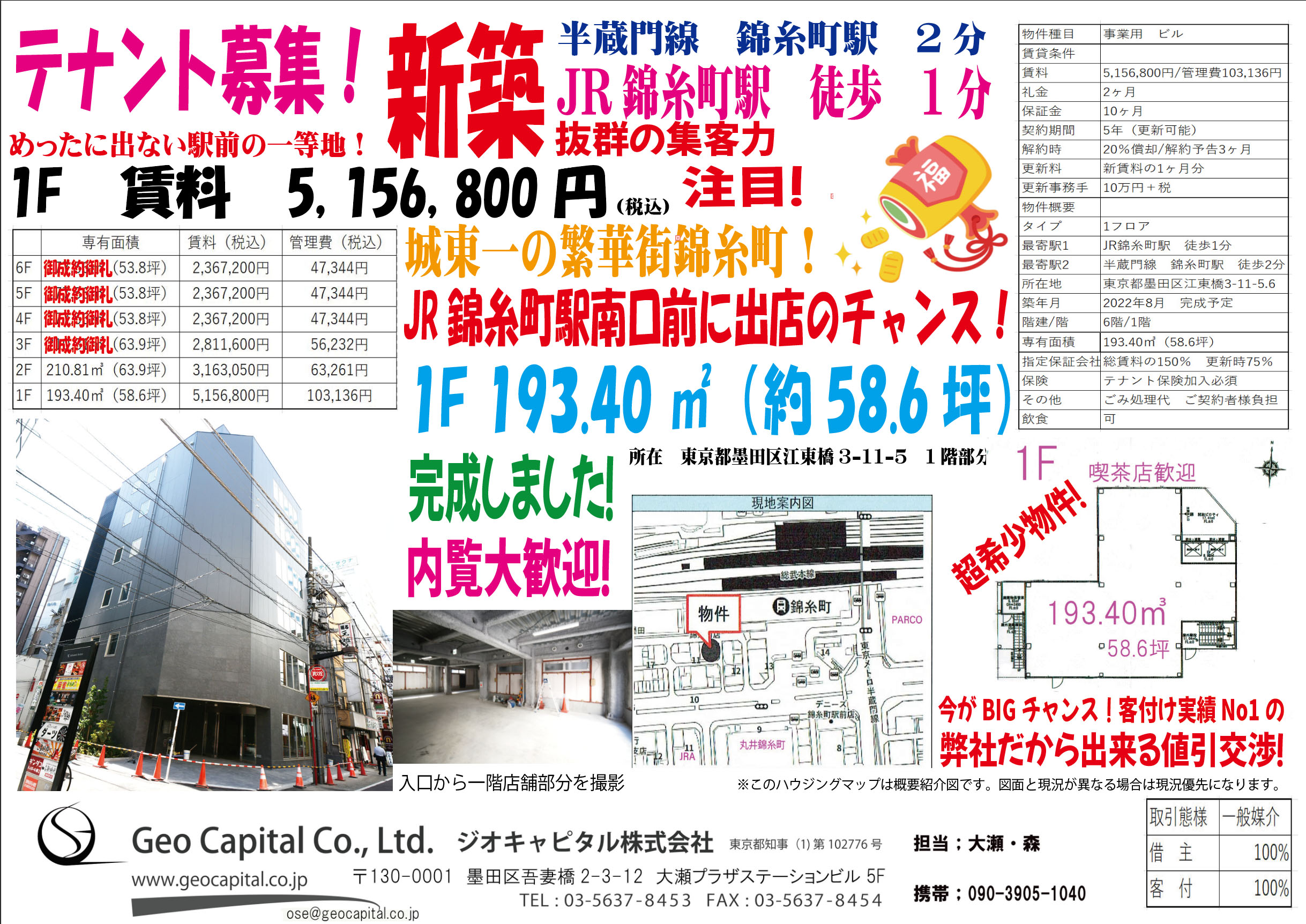 | 1F | 5,156,800円/103,136円 | 2カ月/10カ月 | 193.40㎡(58.6坪) | 詳細はこちら |