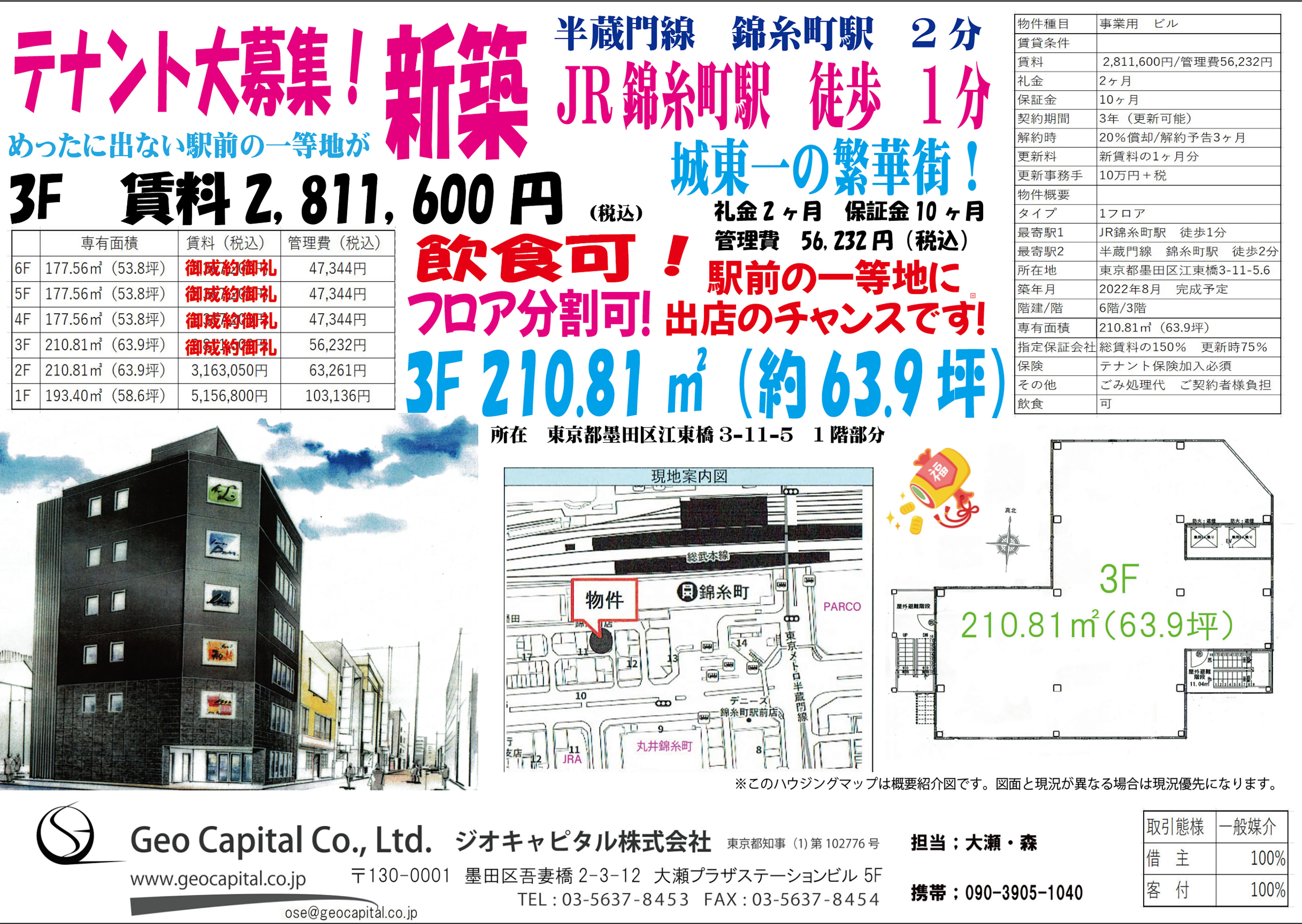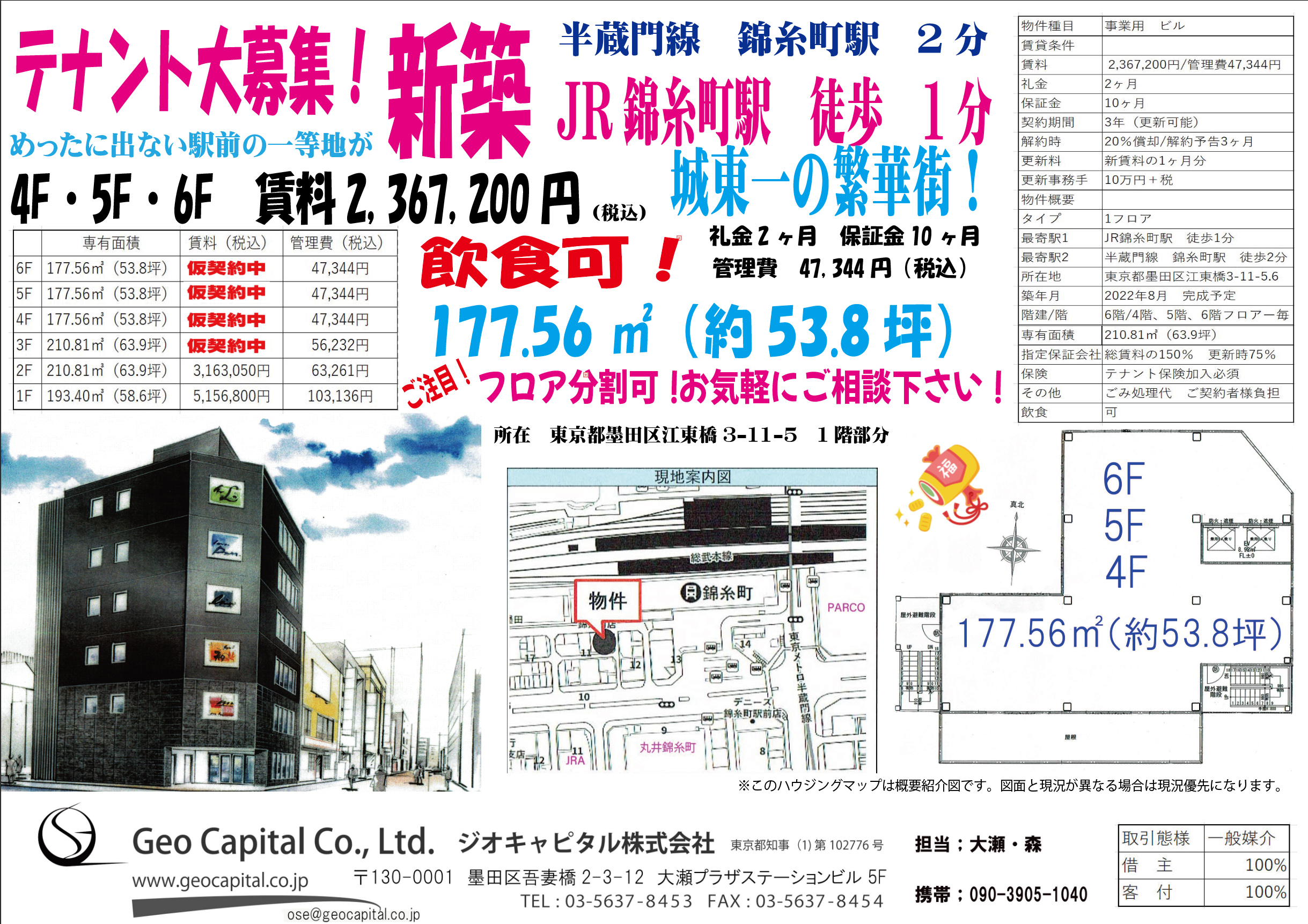 | 4F | 2,367,200円/47,344円 | 2カ月/10カ月 | 177.56㎡(53.8坪) | 詳細はこちら |